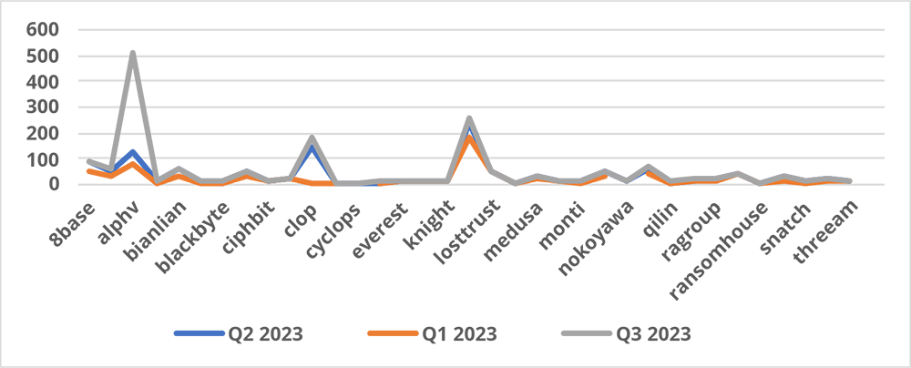 Q3 showed an increase in activity across almost all ransomware groups. The top five ransomware groups ranked by volume include AlphV, Lockbit, Cl0p, 8base, and Play.
