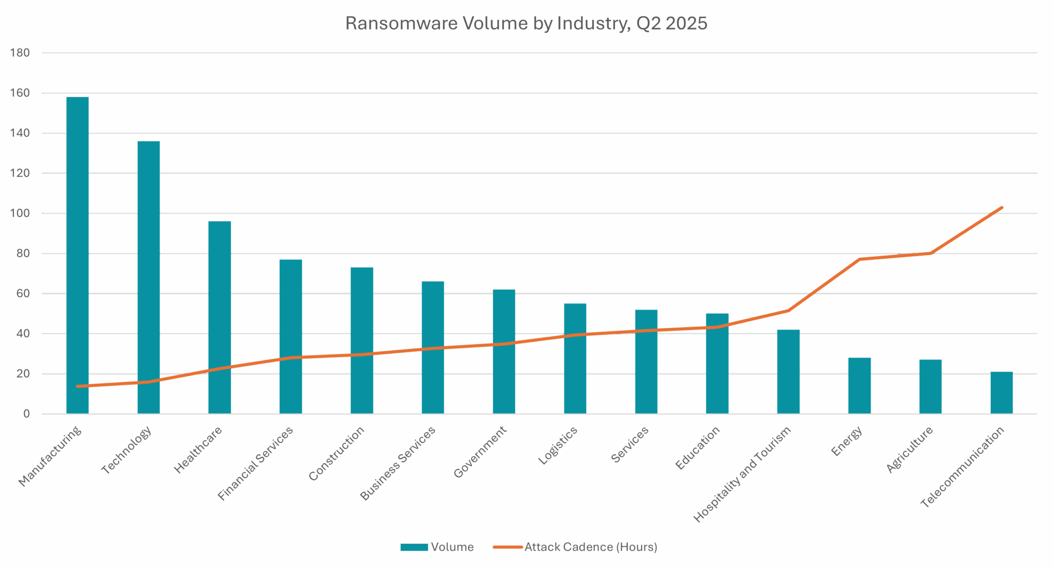 Manufacturing (157 attacks, approximately one every 13.6 hours), technology (136 attacks, approximately one every 16 hours), and healthcare (95 attacks, approximately one every 22.5 hours) were the most targeted industries in Q2.