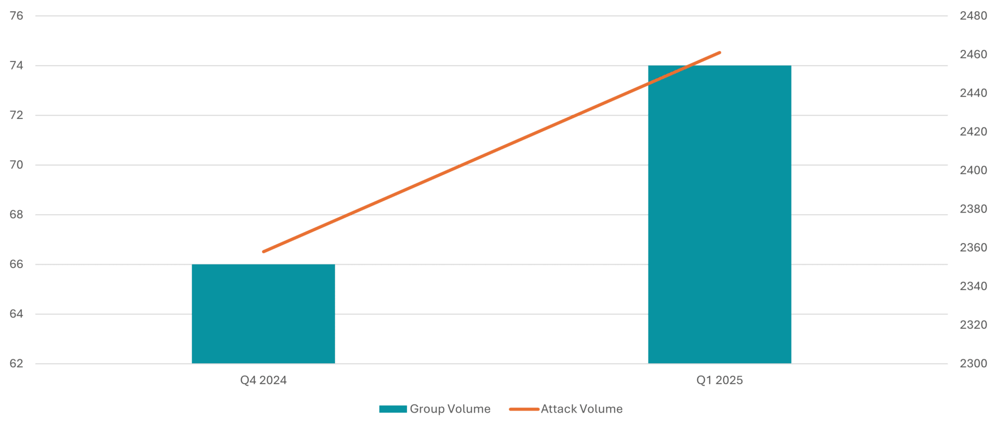 According to CyberMaxx research, there were 74 active groups responsible for 2,461 recorded incidents in Q1 2025. This figure marks a 4.3% increase over the previous quarter, which saw 66 active groups conduct 2,358 attacks.