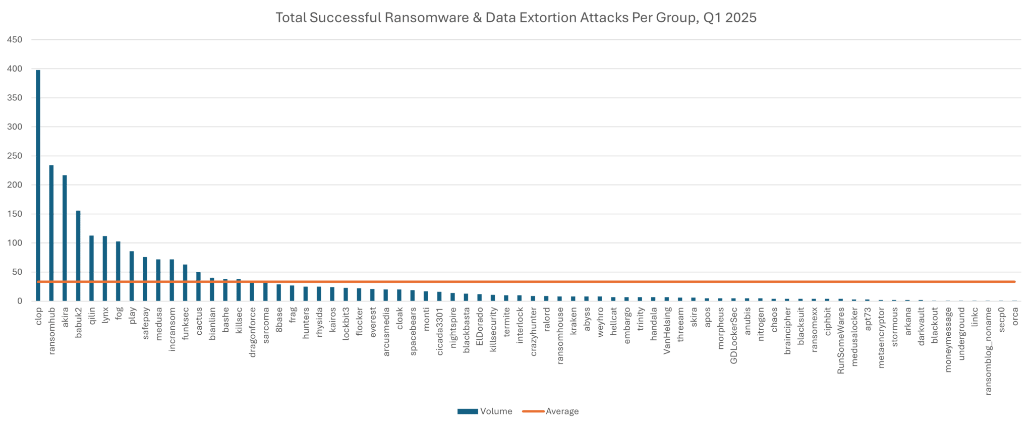 In Q1 2025, ransomware groups averaged 33.2 successful attacks each. With 398 attacks, Cl0p was the most active group this quarter, representing approximately 16% of all successful attacks.